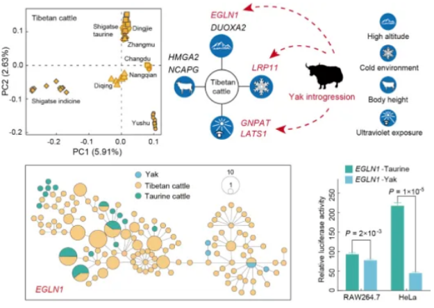 该研究顺利获得对海拔3400一4300米的8个青藏高原黄牛群体的父系、母系和核基因组水平进行系统评估,发现青藏高原黄牛群体内部遗传多样性非常高,至少可分为5个高度分化的群体,表明青藏高原拥有丰富的地方黄牛遗传资源,具有极大的挖掘潜力。
