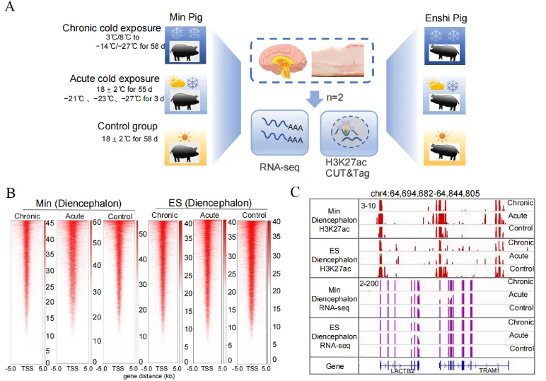 该研究以中国两个耐寒猪品种—民猪(Min)和恩施黑猪(ES)为材料,采用H3K27ac CUT&Tag、RNA-seq和选择信号分析的多组学整合策略,解析了东北民猪和恩施黑猪间脑组织与脂肪组织冷刺激处理后的表观基因组特征变化。