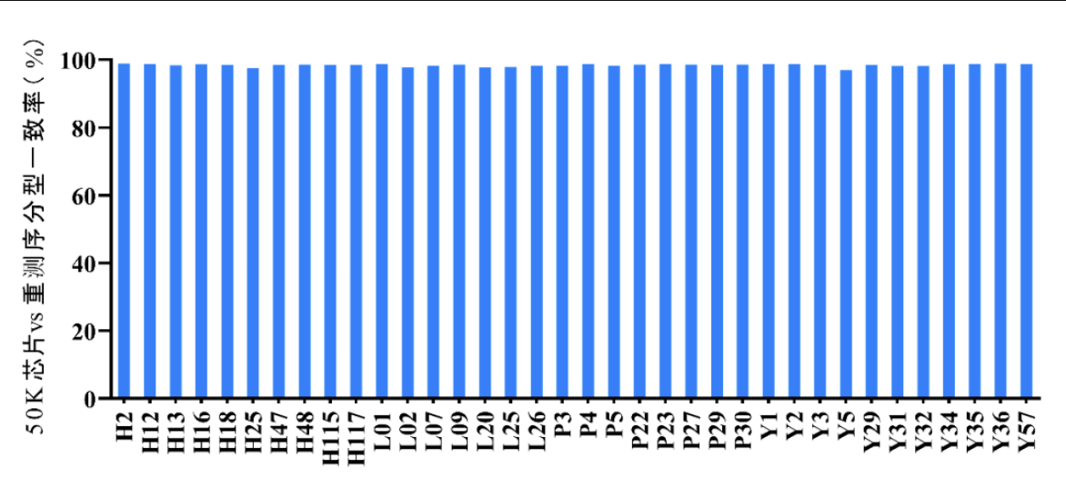 图7 芯片捕获测序和全基因组重测序分型一致率统计柱状图